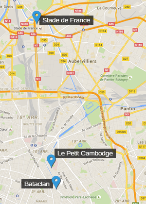 Também houve duas explosões nas proximidades do Stade de France, onde o presidente francês, François Hollande, acompanhava uma partida de futebol entre França e Alemanha.