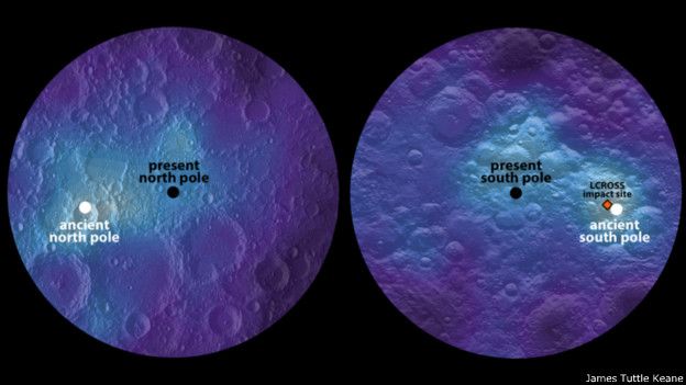 As placas de gelo estão em polos opostos, e traçam uma linha entre ambas que passa pelo centro da Lua - o que os cientistas acreditam que fosse seu eixo de rotação.